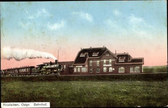 Stacja Mikołajki - budynek stacyjny, budynki towarzyszące, pociąg M 9722 relacji Ełk - Mikołajki, prowadzony parowozem Ol49-11 (MD Ełk) skończył bieg, w lewo - kierunek Ełk, w prawo - kierunek Biskupiec Reszelski (Czerwonka).