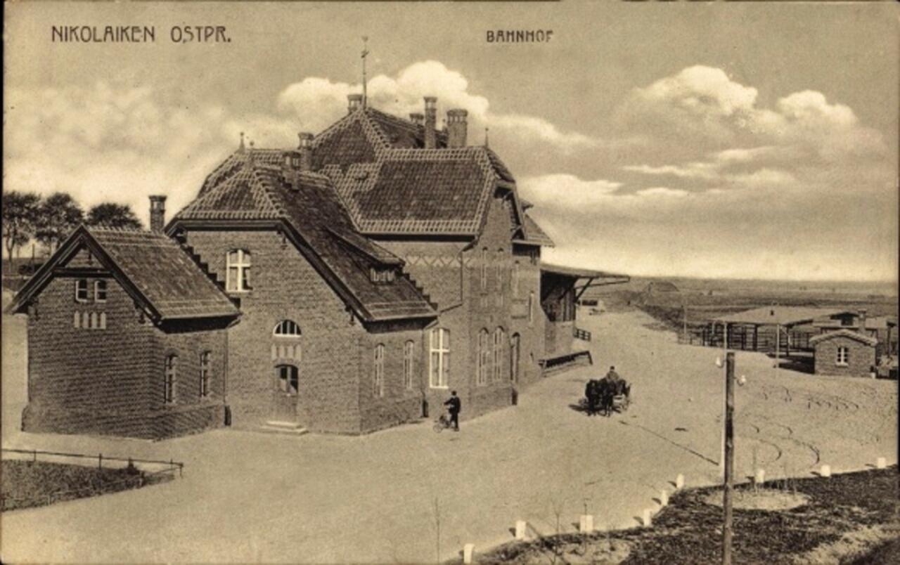Stacja Mikołajki - budynek stacyjny, pociąg M 9722 relacji Ełk - Mikołajki, prowadzony parowozem Ol49-11 (MD Ełk) skończył bieg, widok w kierunku stacji Ełk.