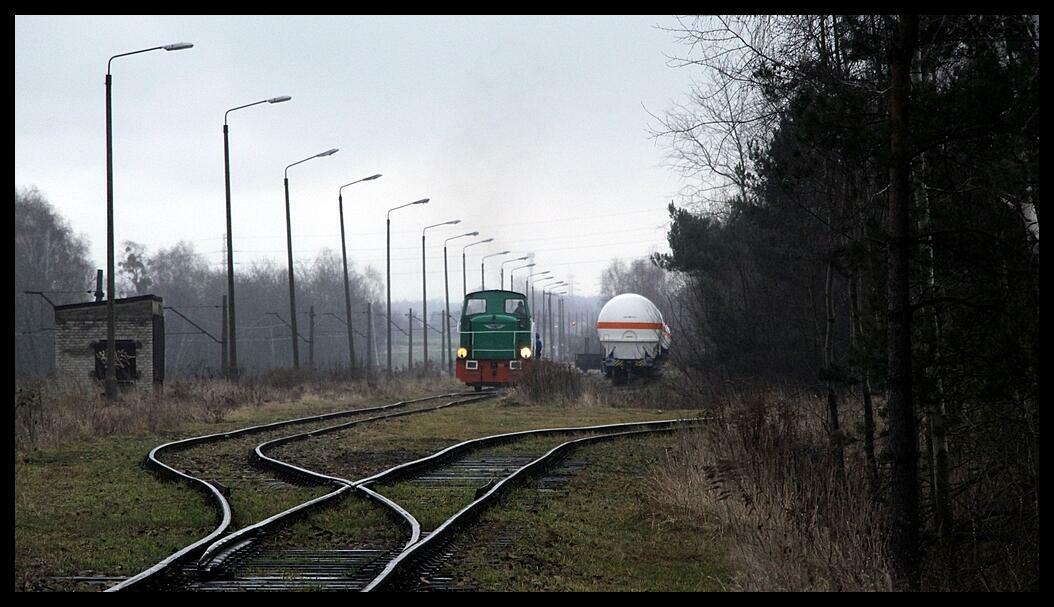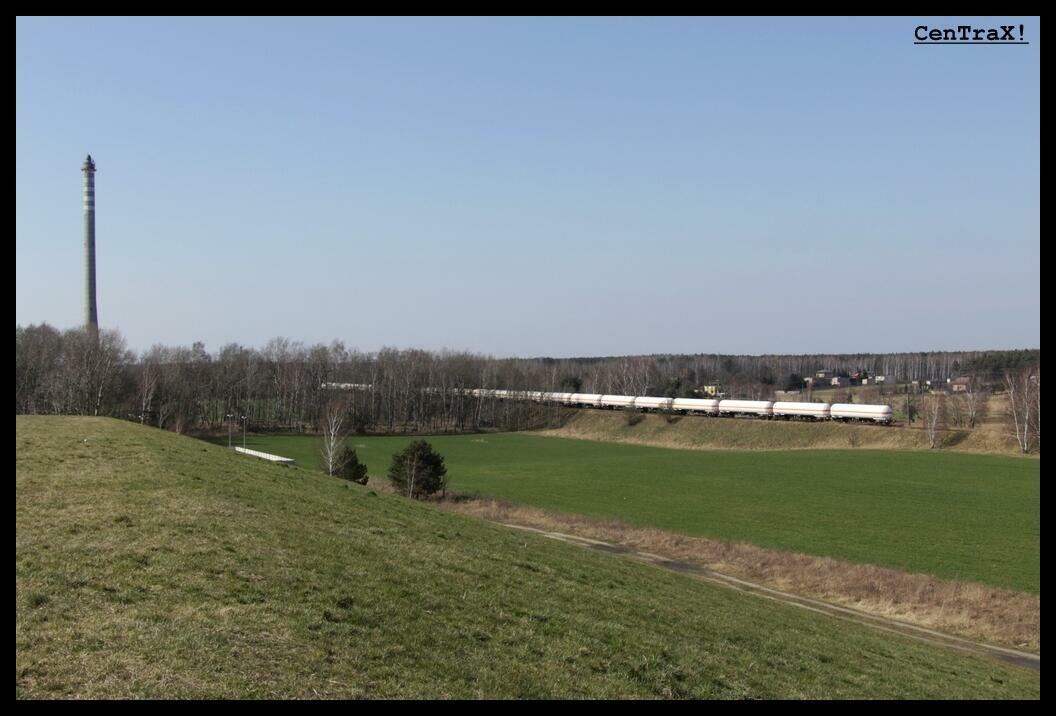 Tory zdawczo-odbiorcze (w prawo wyjazd z bocznicy) a na nich stojące nowiutkie cysterny gazowe dla Szwajcarii. Widok na północny-zachód, fotka zrobiona z hołdy powstałej w miejscu byłego kamieniołomu a później zasypanego odpadami (wysypisko śmieci, a w ostatnich latach składowane były tam odpady chemiczne w całkowicie odkrytych bunkrach… ).