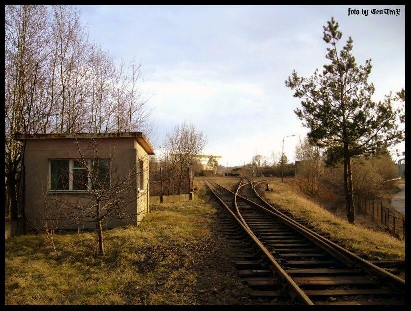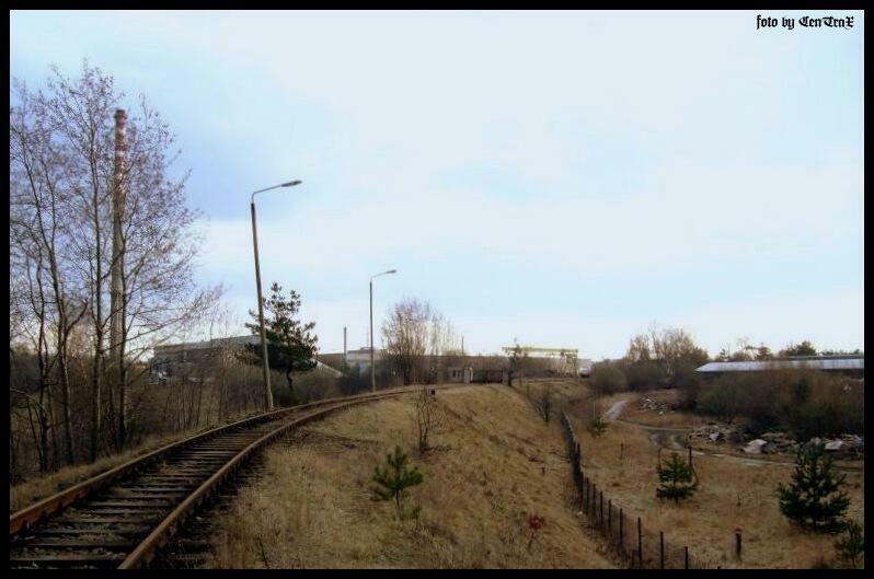Widok na bocznicę na terenie fabryki. W dolnym lewym rogu widać bramę wjazdową (kiedyś były tu dwa tory ale "lewy" już nie istnieje, możliwe że była to osobna bocznica jakieś zakładu).