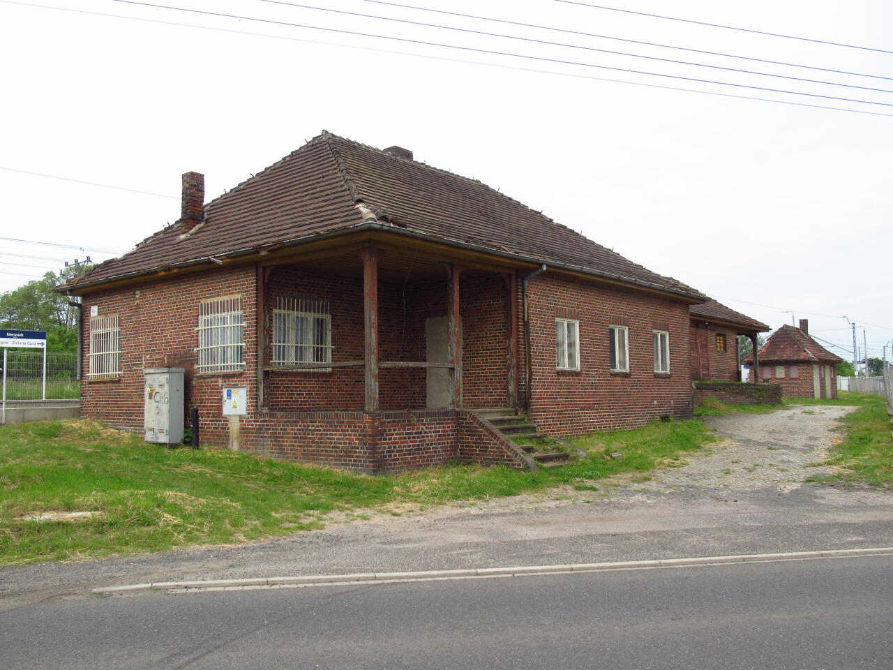 2009-08: - budynek stacyjny z magazynem i rampą transportową - jednokondygnacyjny, murowany z cegły, kryty dachówką; wysunięty poza podstawę dach może pełnić funkcję małej wiaty przystankowej, - ustęp - budynek murowany z cegły, kryty dachówką - na peronie 1 przed wejściem do tunelu przejścia podziemnego na peron 2. (info: Serg). |