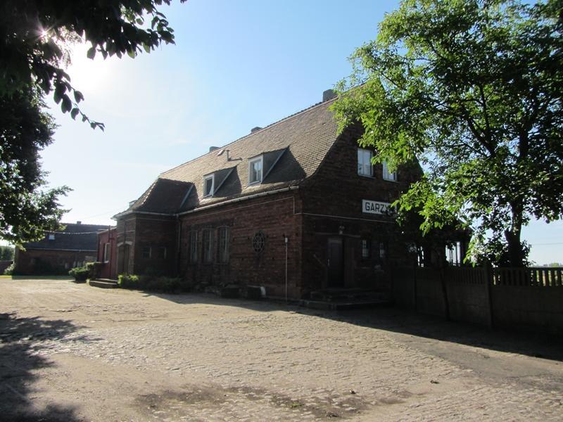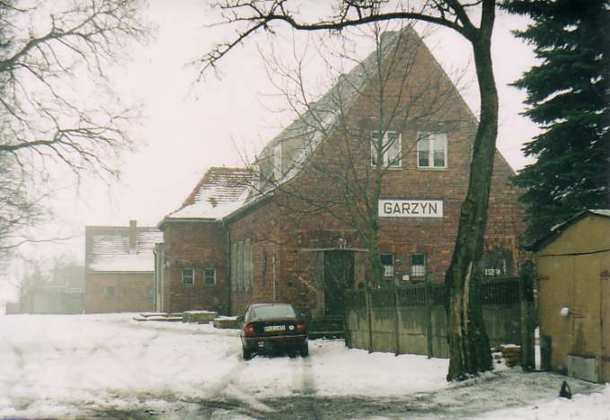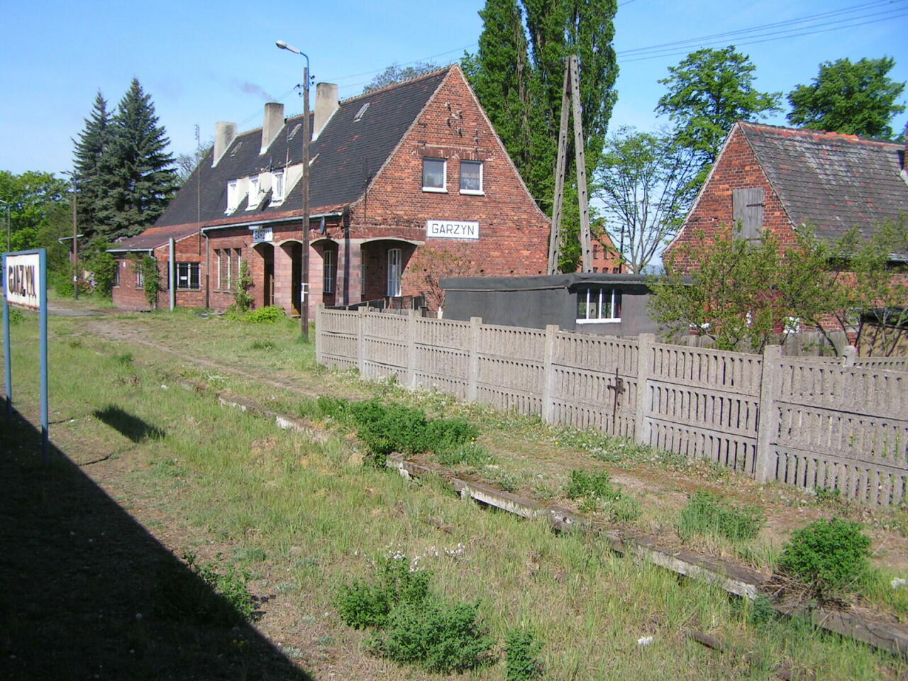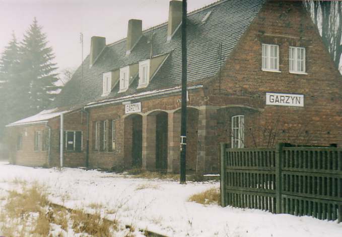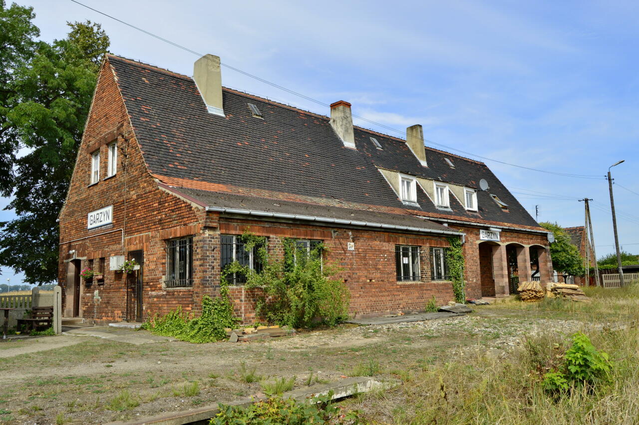 Garzyn. Budynek dworca wraz z nieczynną nastawnią, mieszczącą się w przybudówce, na parterze. Widok od strony peronu; w lewo Kąkolewo/Leszno, w prawo Gostyń.
