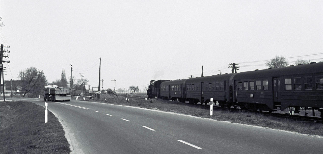 Ol49 z ryflakami na haku jako pociąg osobowy do Jarocina opuszcza stację Garzyn, w tle semafor wjazdowy. Widok w kierunku wschodnim (Kąkolewo/Leszno).