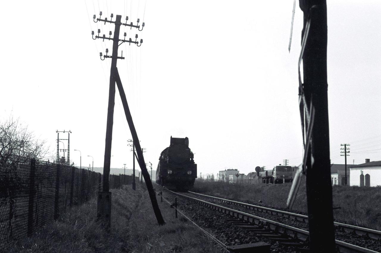 Wjazd na stację w Garzynie pociągu z Leszna z Ol49 na czele. Widok w kierunku zachodnim.