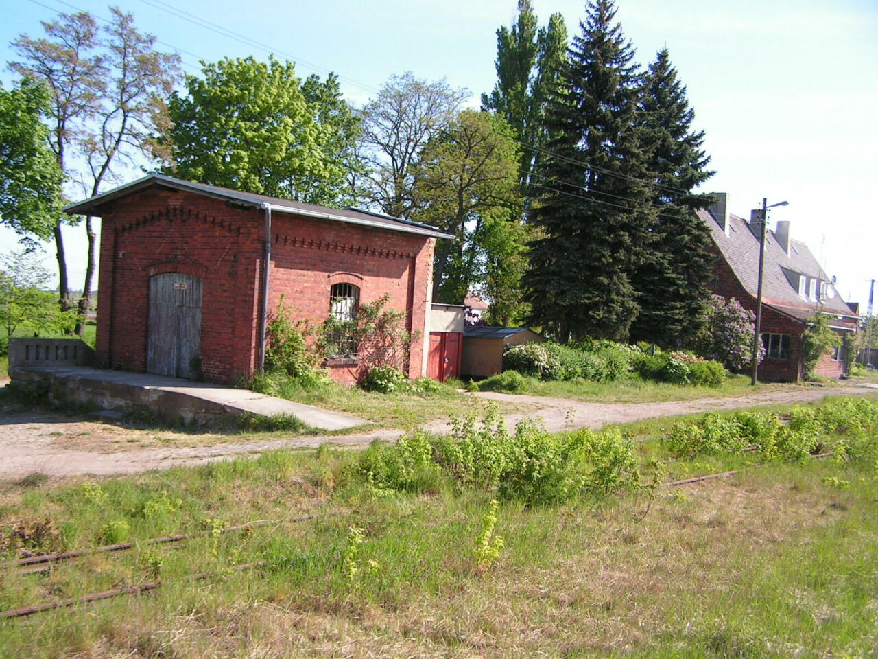 Od lewej magazyn z rampą i placem, dalej budynek budynek dworca z pomieszczeniem nastawni na parterze, w przybudówce. Widok od strony peronów i wjazdu z Kąkolewa/Leszna.