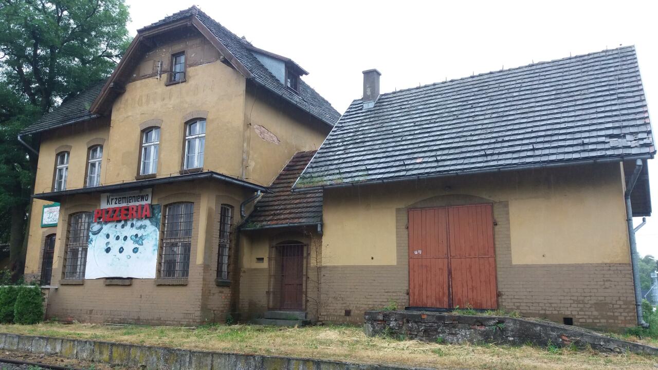 budynki dworcowe: adaptowany do innych celów, na parterze znajduje się pizzeria
