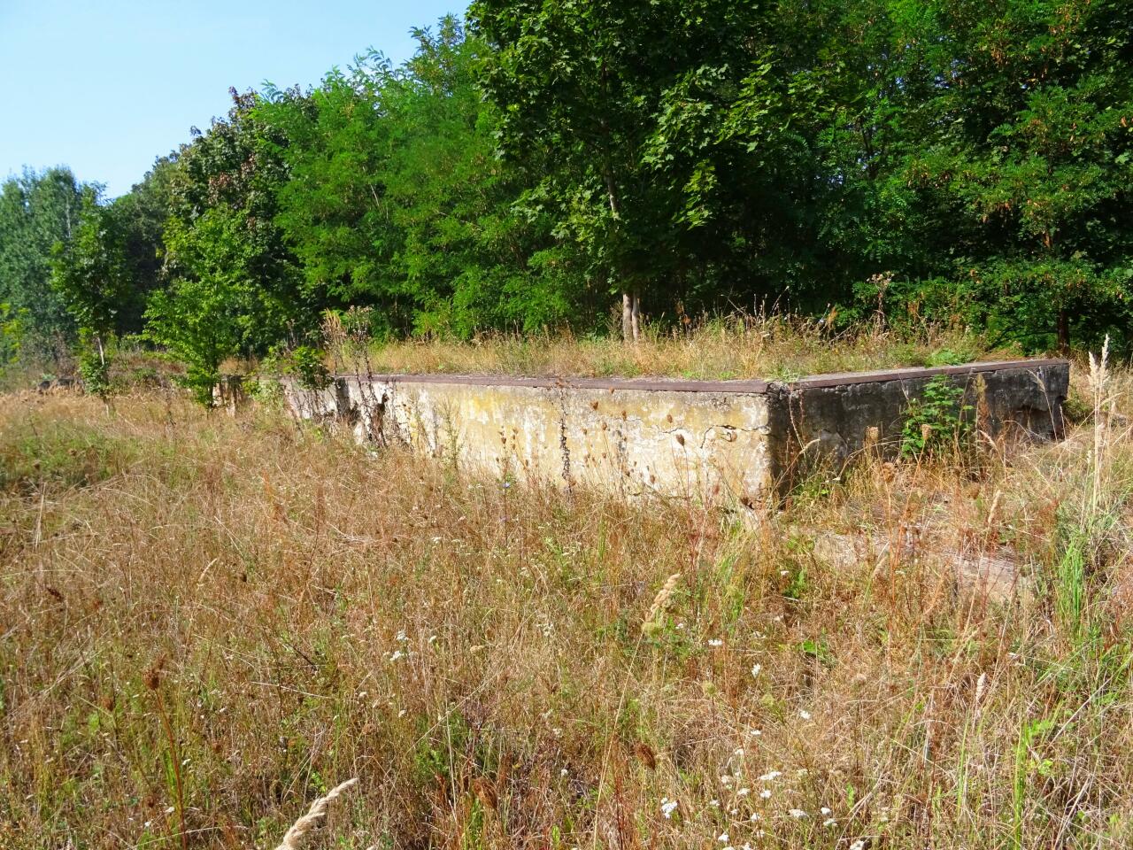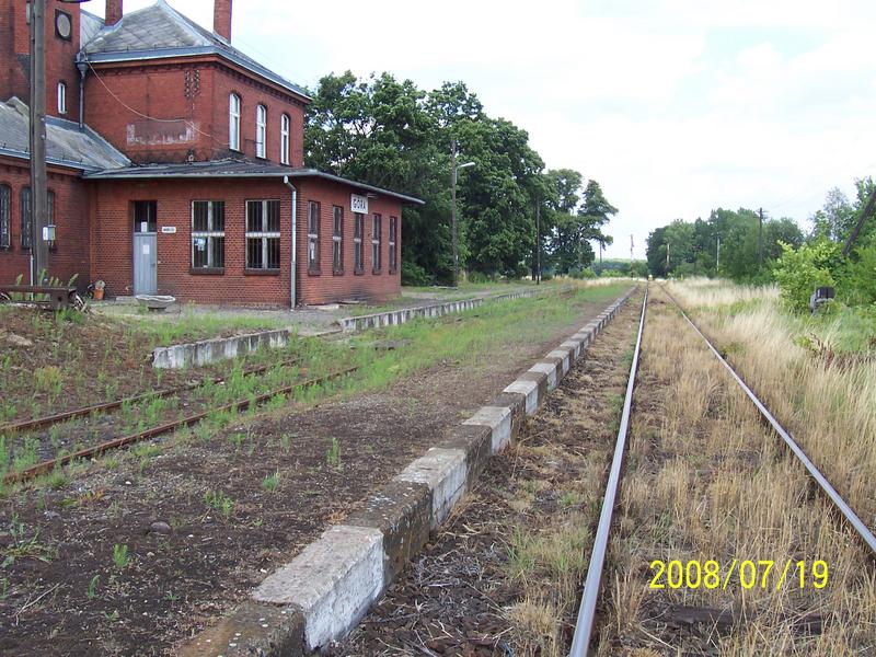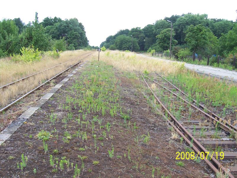 Widok na dawną stację (perony i plac ładunkowy) w kierunku Leszna (zachód).