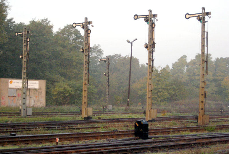 Stacja PKP Wolsztyn. Semafory wyjazdowe na południowo-wschodniej głowicy stacji. W lewo wyjazdy do Leszna, Kolska/Nowej Soli i Grodziska Wielkopolskiego/Poznania, w prawo na perony.