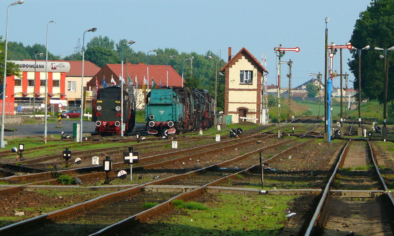 Wolsztyn 2007. Parada parowozów. Widok od strony wjazdów z Leszna, Kolska/Nowej Soli i Grodziska Wielkopolskiego/Poznania, w kierunku północnyo-zachodnim. W tle wiadukt drogowy w ciągu ul. Niepodległości.
