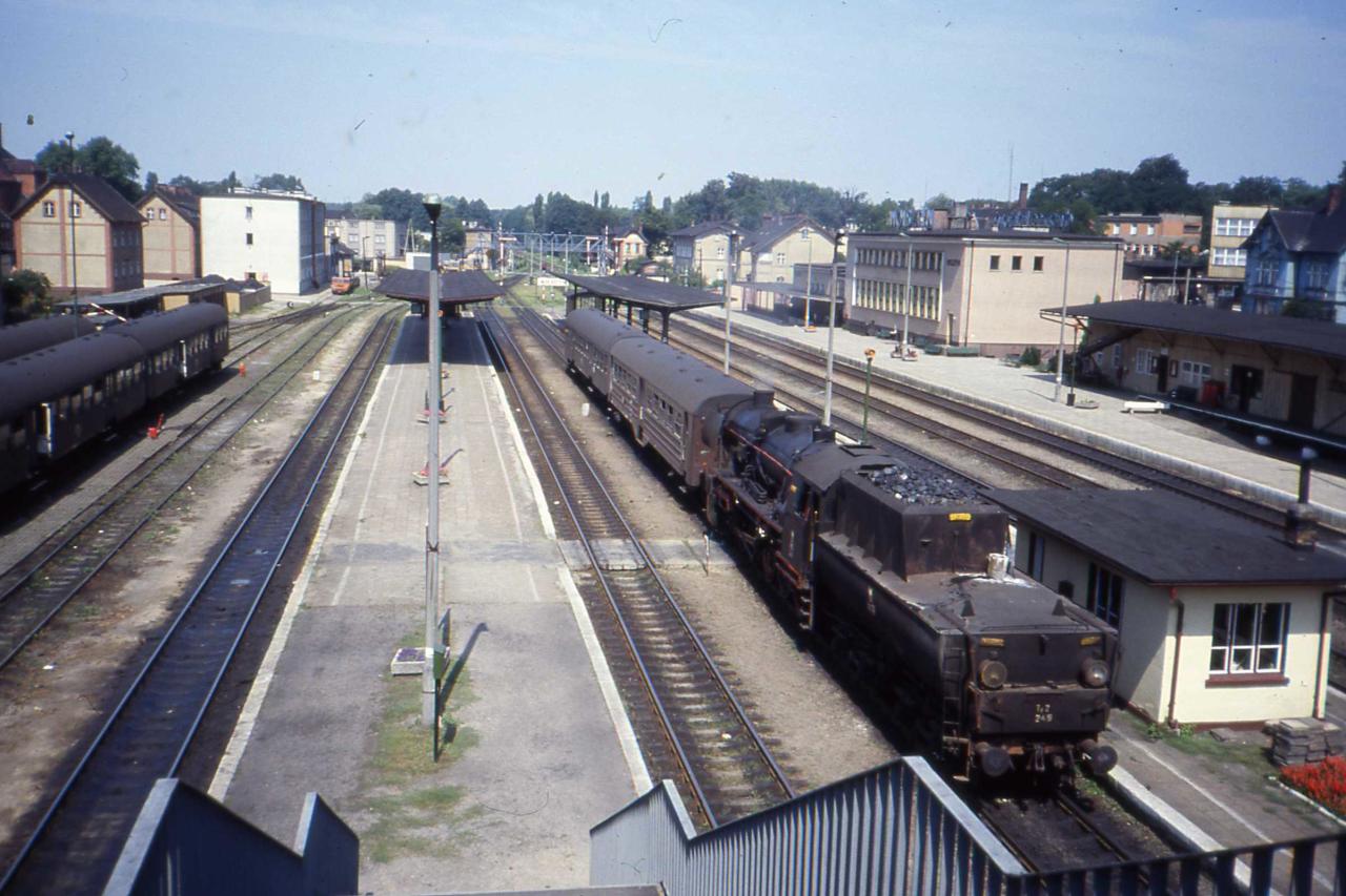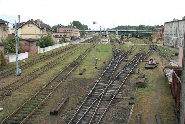 Widok na wjazd w perony od strony Sulechowa i Zbąszynia, z kładki nad torami. W tle, po lewej budynek dworca. Kierunek południowo-wschodni.