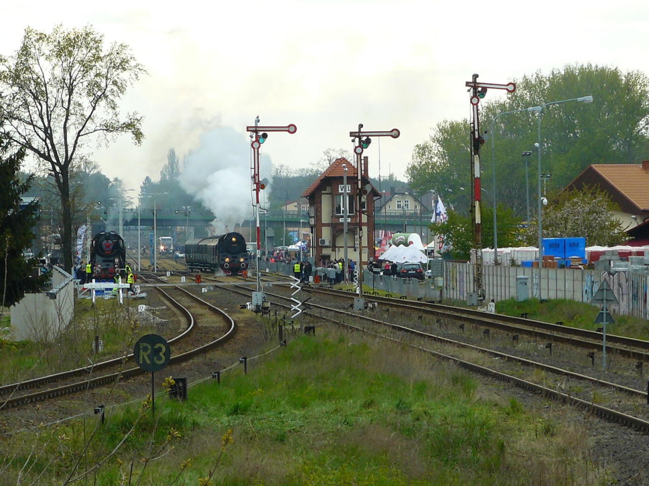 Był to wybitnie deszczowy dzień. Parowóz Ok1-359 ustawiono na torze pod magazynem stacyjnym. Było to jedno z nielicznych miejsc gdzie można było znaleźć schronienie przed deszczem. Z każdą godziną nasilał się jednak ruch miłośników kolei, a wieczorem panował już tutaj całkiem spory gwar. Widok od strony wjazdów z Leszna, Kolska/Nowej Soli i Grodziska Wielkopolskiego/Poznania. Kierunek północno-zachodni.