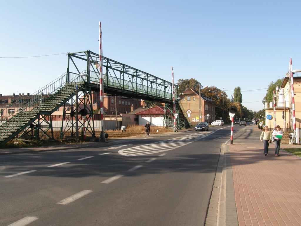Przejazd drogowy w ciągu ulic Poniatowskiego i 5 Stycznia wyposażony w stare zapory napędzane dawnymi mechanizmami. W lewo perony, w prawo Sulechów, Zbąszyń. 46,2 km / 38,6 km.