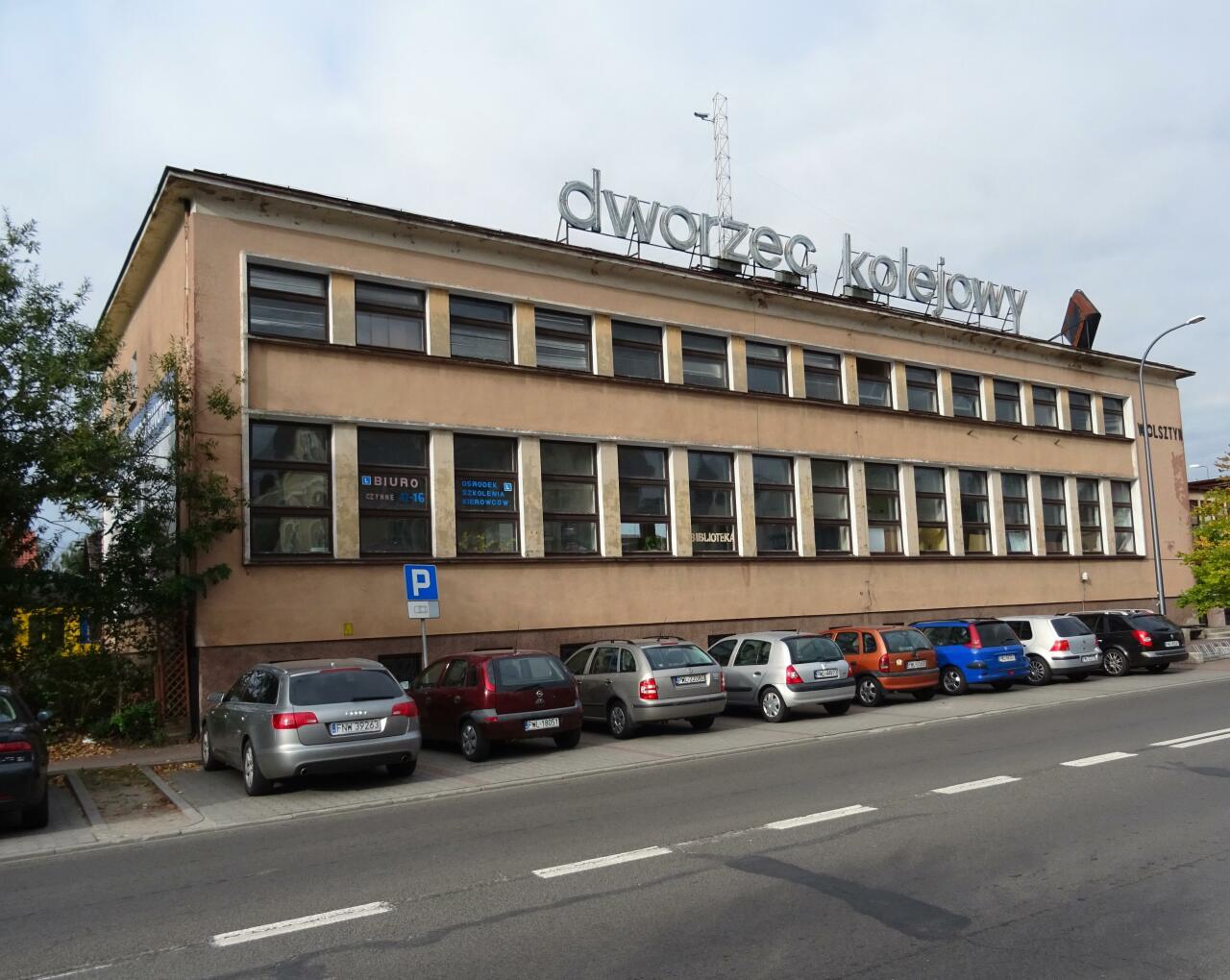 Stacja PKP Wolsztyn. Budynek dworcowy w całej swej rozciągłości. Widok od strony dworca autobusowego.
