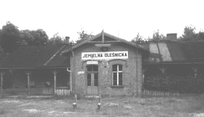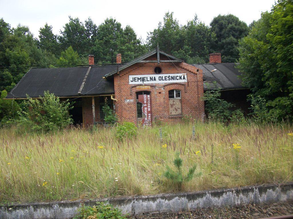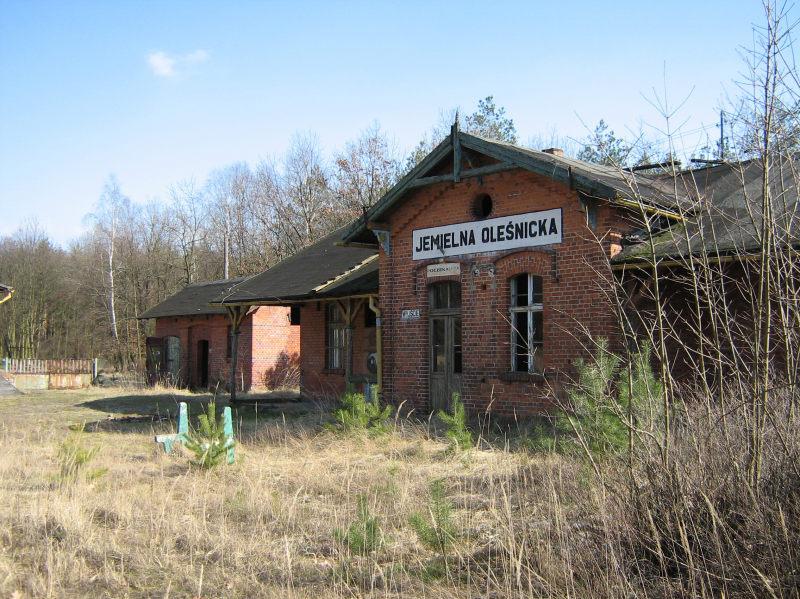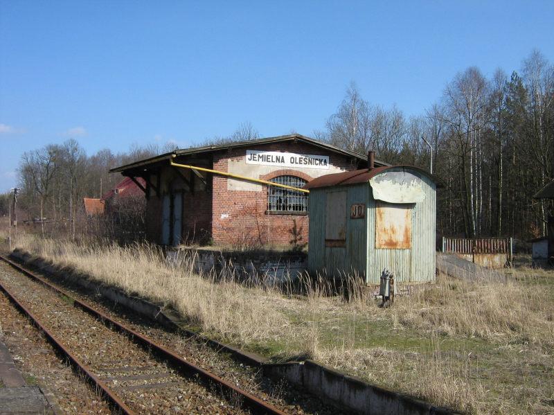 Stacja Jemielna Oleśnicka. Widok na budynek dworca od strony peronów, w kierunku południowym; w lewo Syców, w prawo Oleśnica.
