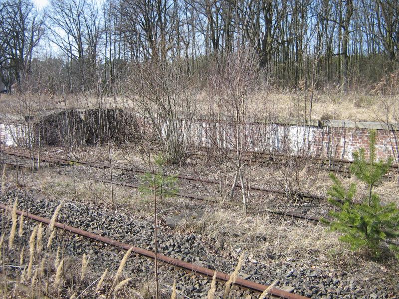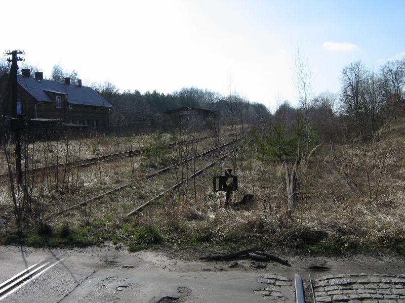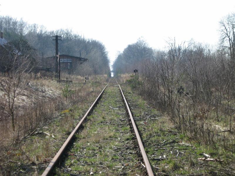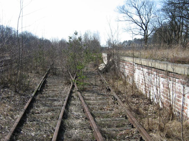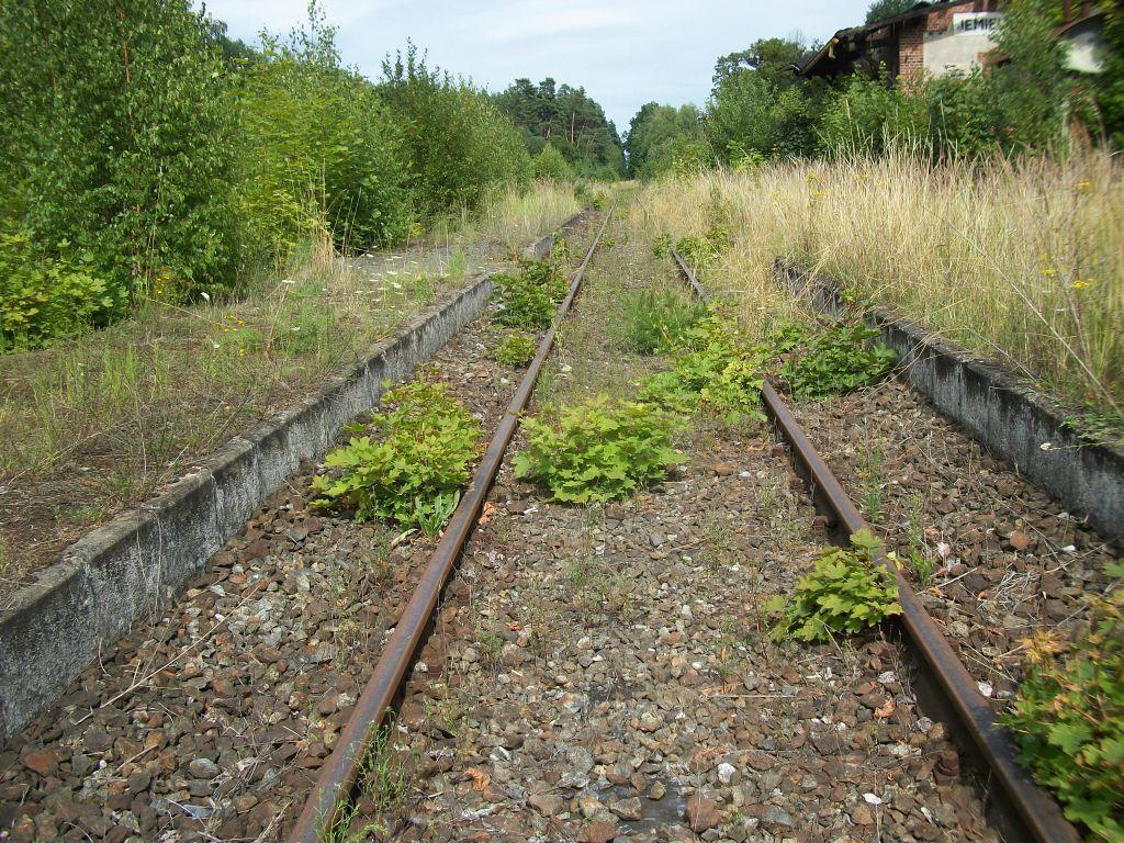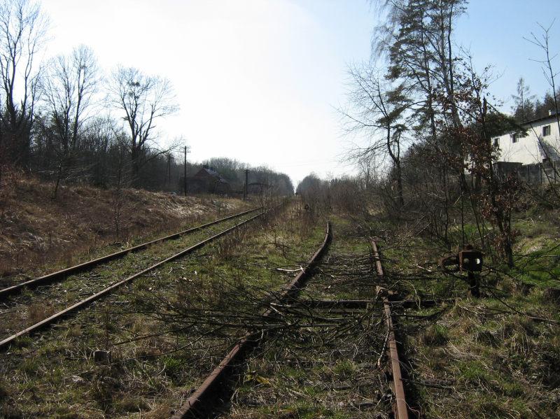 Zarastające tory na dawnej stacji. Z lewej perony i (poza kadrem) budynek dworca.