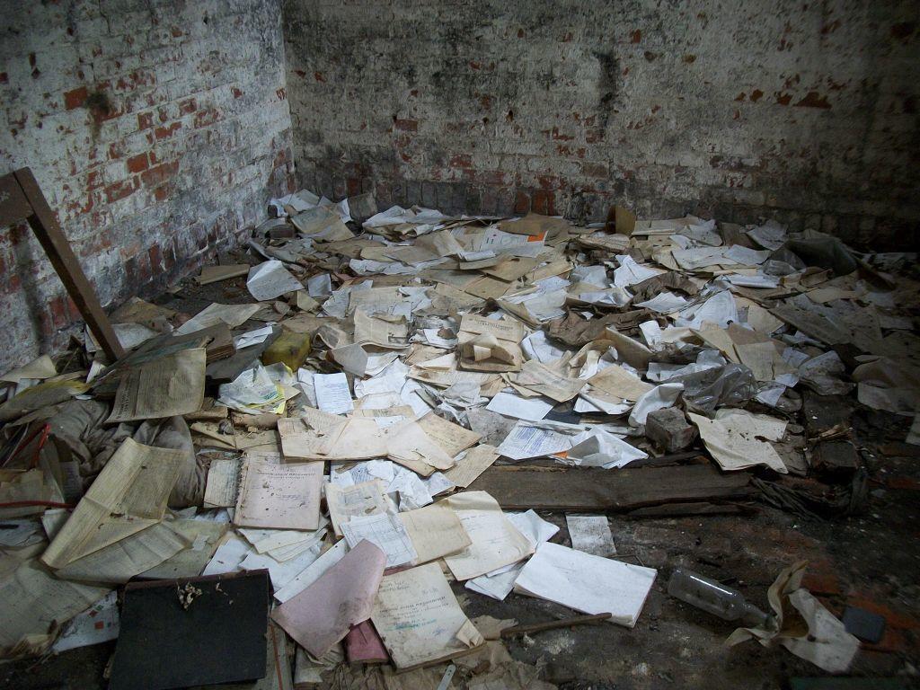 Sterta dokumentów kolejowych w dawnym budynku dworca.
