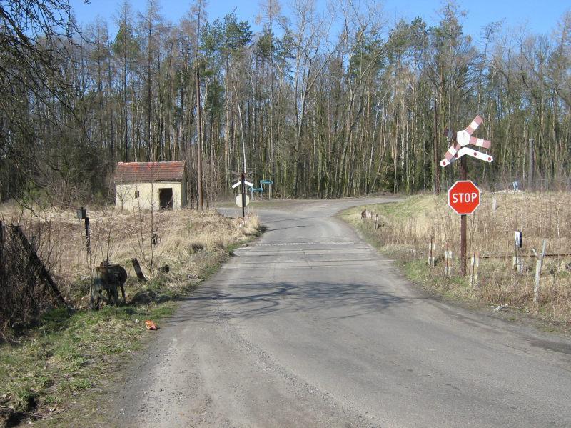 Przejazd kolejowy; w lewo perony, w prawo Syców.