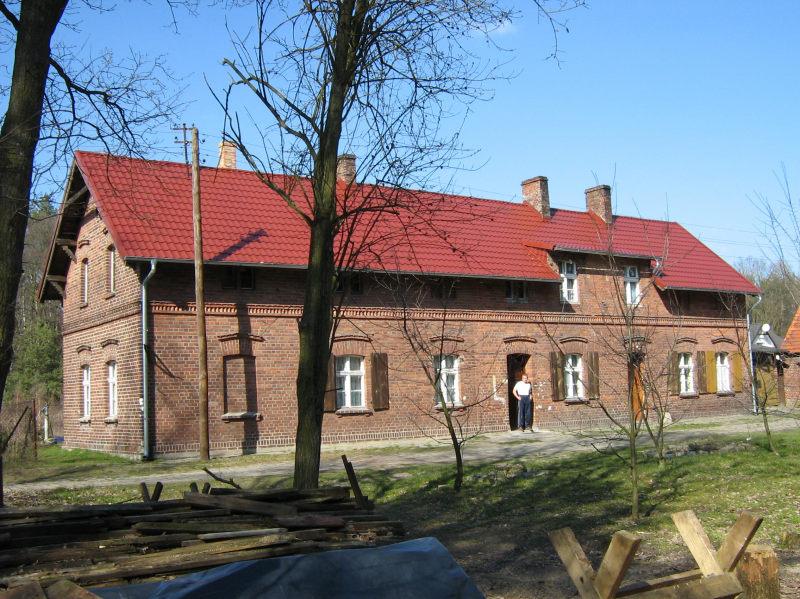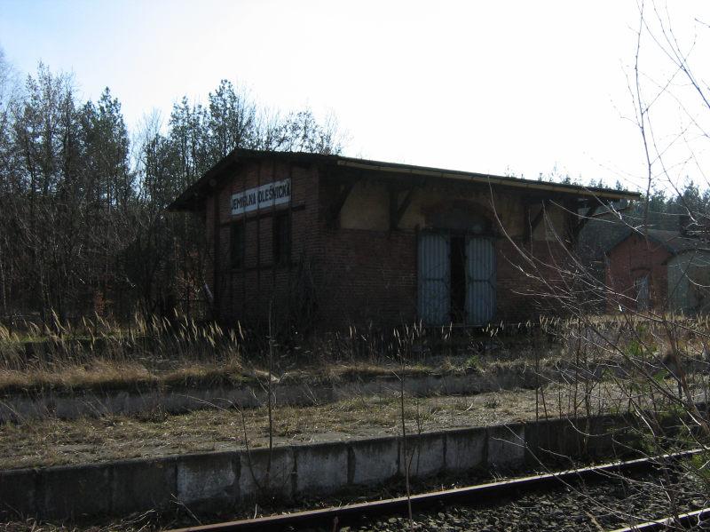Zabudowania dawnej stacji, od prawej: dworzec, nastawnia, magazyn towarowy. Widok od strony peronów i wjazdu z Oleśnicy.