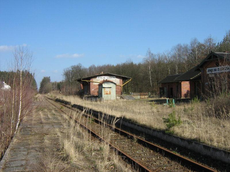 Obie krawędzie peronowe na przystanku Jemielna Oleśnicka. Z prawej fragment magazynu towarowego. Widok w stronę Sycowa.