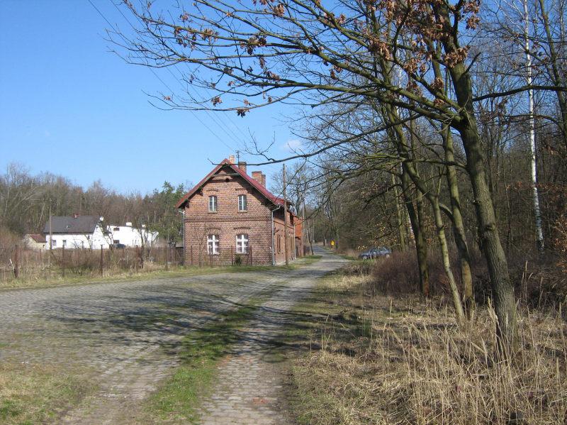 Droga dojazdowa do dworca (za plecami). W tle kolejowy budynek mieszkalny. Widok w kierunku Sycowa.