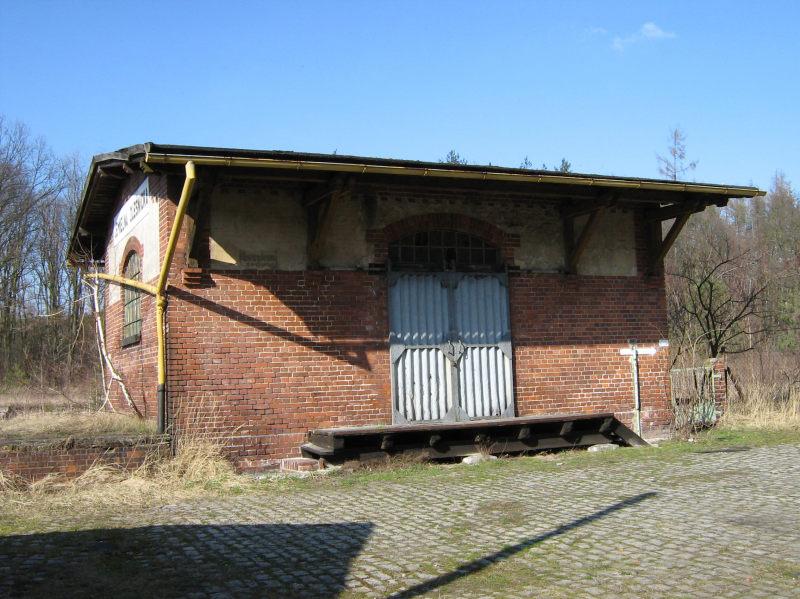 Magazyn towarowy - ściana szczytowa. Z lewej fragment dawnej nastawni. Z prawej, poza kadrem, dworzec. Za nastawnią znajdują się perony. Na wprost kierunek Syców.