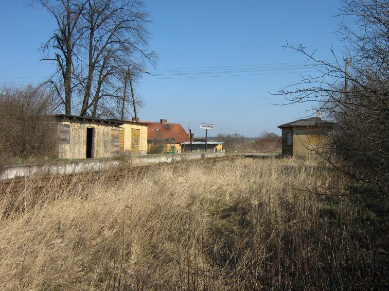 Peron na przystanku Poniatowice - jeszcze kilka miesięcy temu po lewej stał niewielki budynek gospodarczy. Widok w stronę Sycowa.