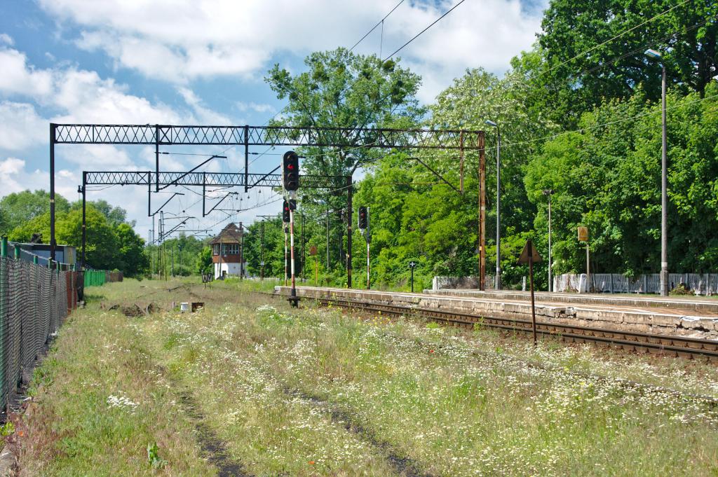 Wyjazd w kierunku Wrocławia (południowy-zachód). W tle nastawnia dysponująca Dł, stojąca przy przejeździe kolejowym przez ul. Władysława Broniewskiego.