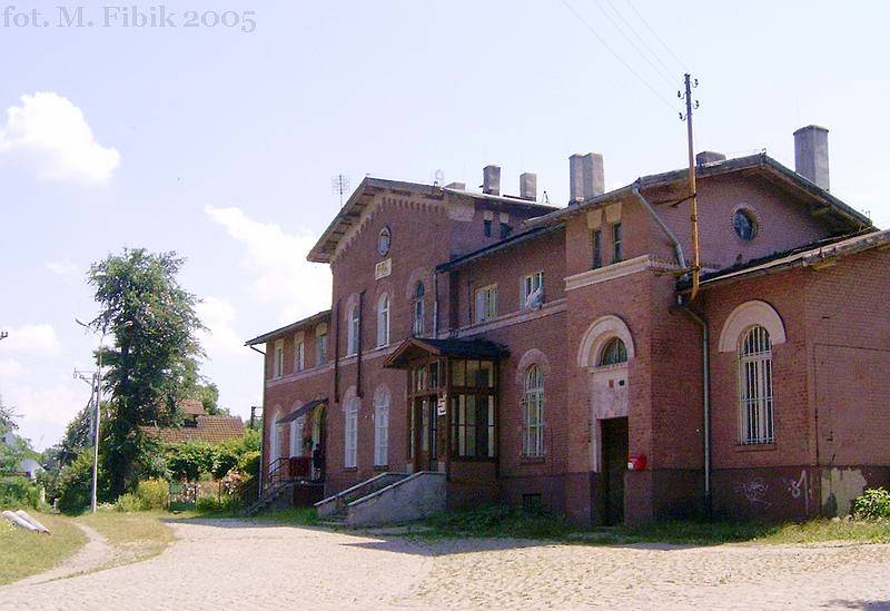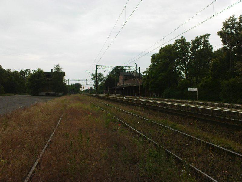 Początek peronów od strony wjazdu z Wrocławia. Z lewej budynek dworca. W tle, po prawej budynek dawnej ekspedycji towarowej z rampą. Kierunek północno-wschodni.