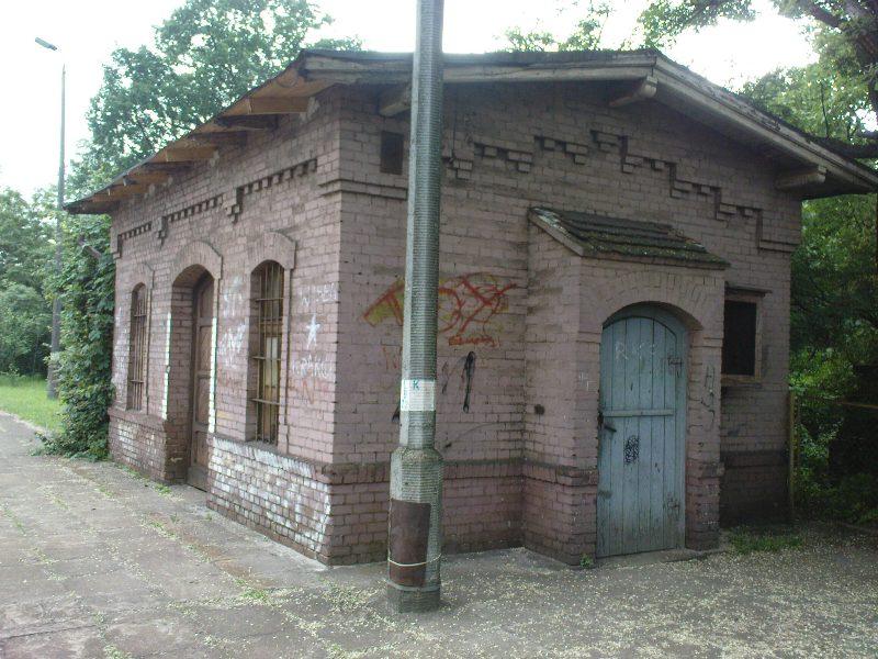Budyneczek przy peronie 1, na zachód od budynku dworca. Widok w kierunku zachodnim; z lewej krawędź peronowa i wyjazd do Wrocławia.