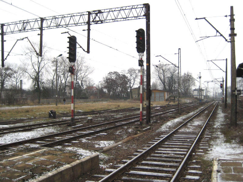 Zakończenie peronów na stacji w Bierutowie. Po lewej znajduje się, niewidoczny na zdjęciu budynek dworca. W tle semafory wyjazdowe oraz nastawnia wykonawcza. Widok w stronę Oleśnicy (północny-zachód).