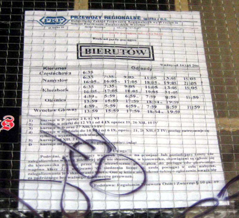 Stacja PKP Bierutów. Gdy budynek dworcowy jest zamknięty, rozkład jazdy jest dostępny za szybą.