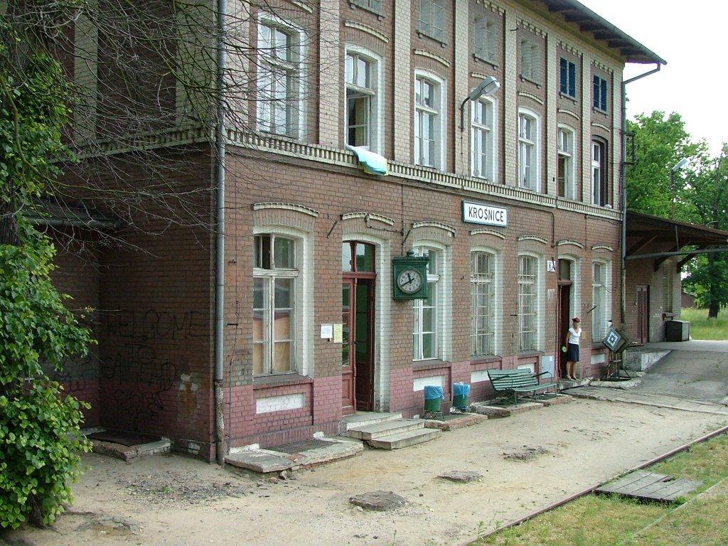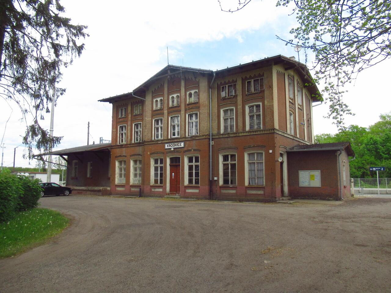 Budynek dworcowy widoczny od strony torów. Widok w kierunku Milicza/Chojnic.