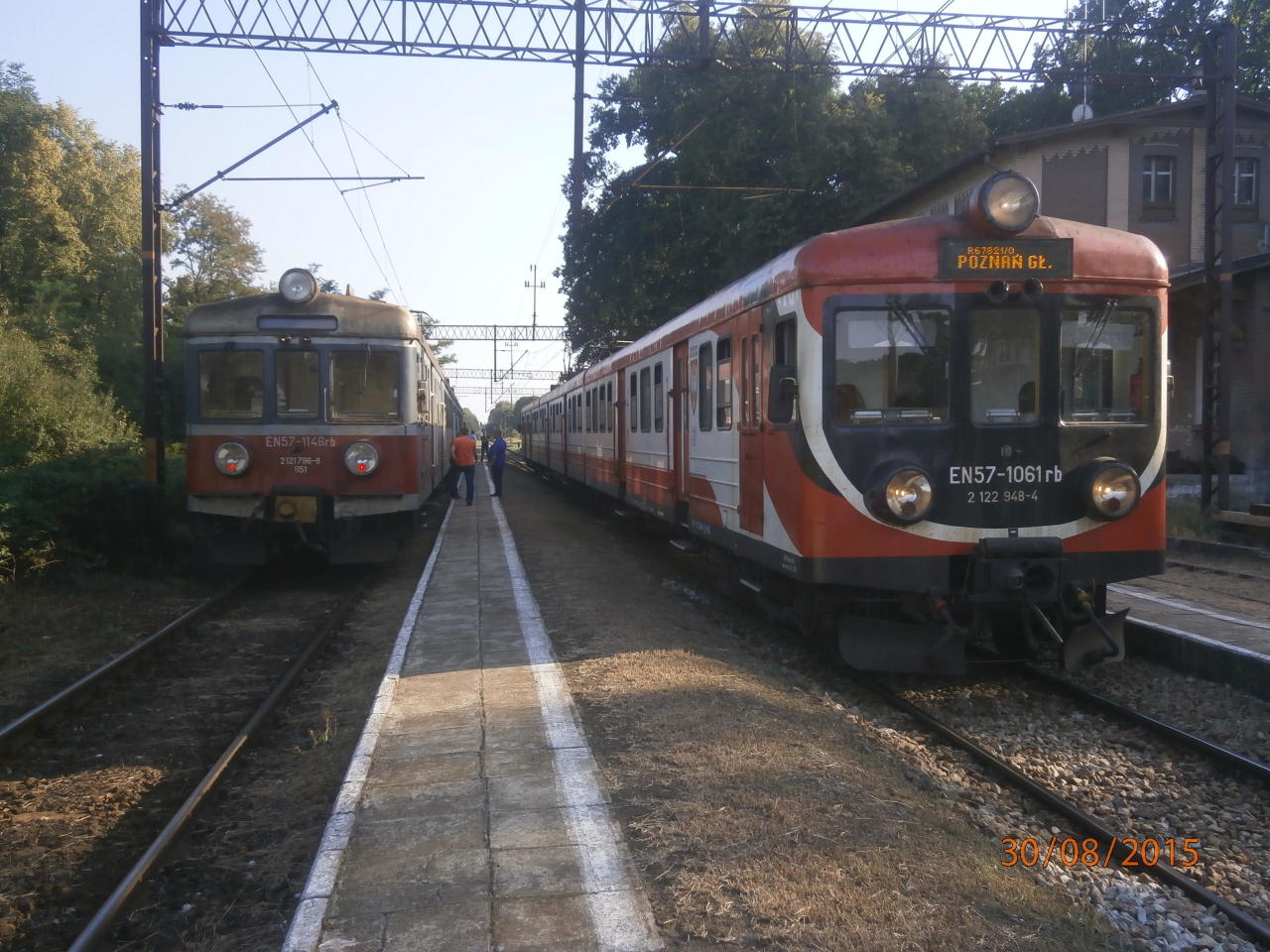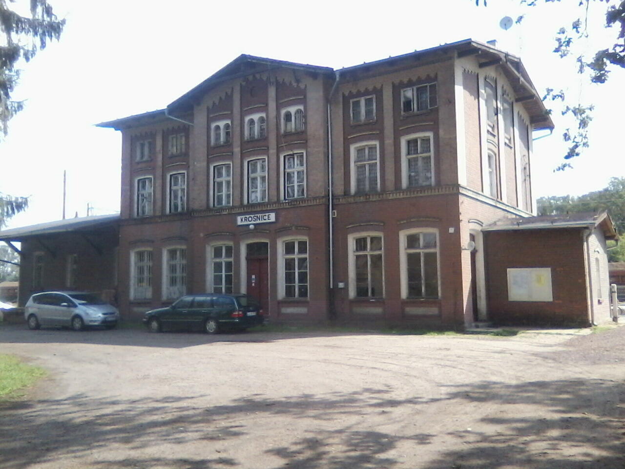 Mijanka dwóch REGIO "Barycz" w Krośnicach. Sytuacja możliwa tylko dwa razy w tygodniu (piątki i niedziele). W pozostałe dni nie zobaczymy tu zatrzymującego się pociągu pasażerskiego (przejeżdżają objazdowe TLKi). Widok w kierunku Grabowna Wielkiego/Oleśnicy.