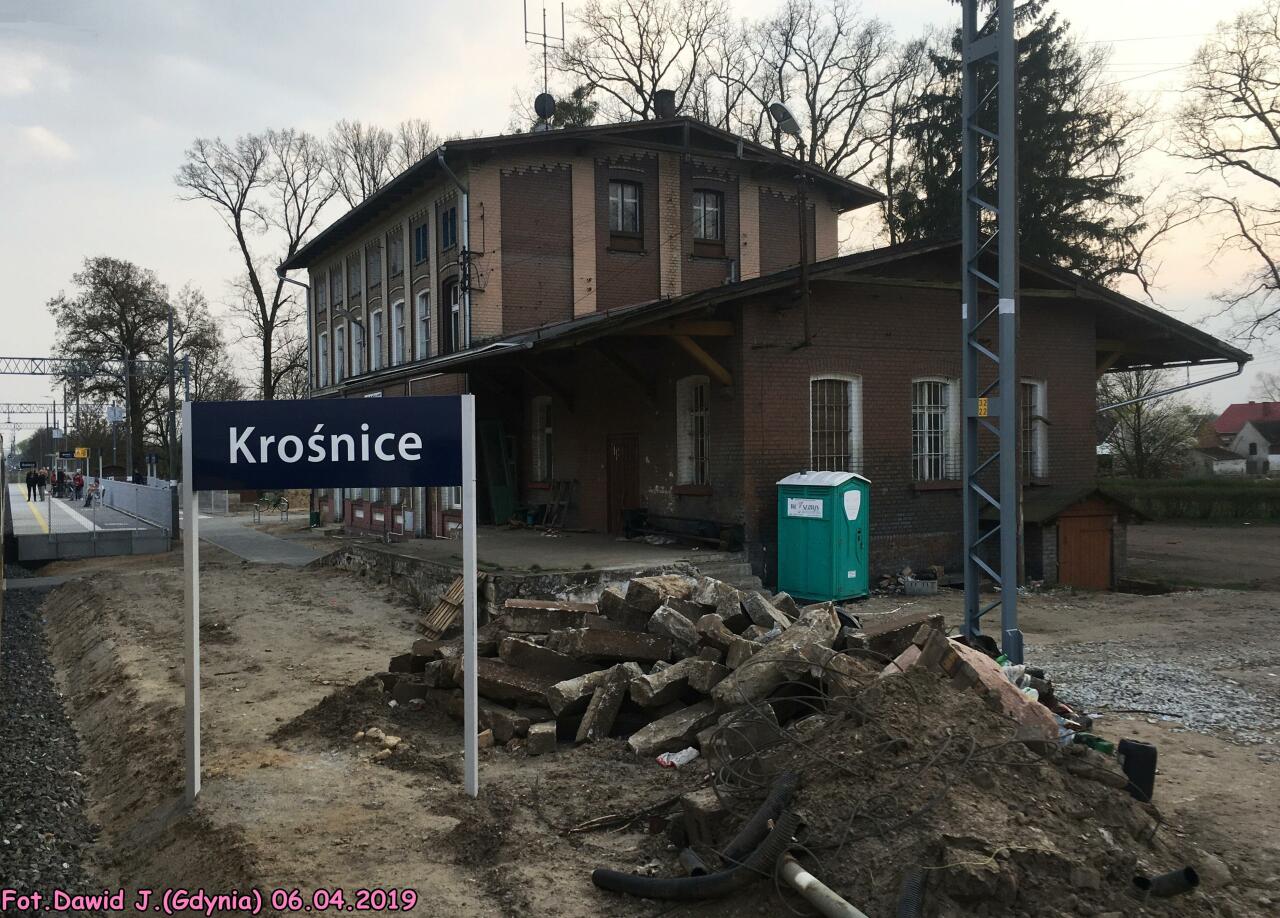 Budynek dworcowy widoczny od strony torów. Tablica z nazwą stacji. Widok w kierunku Grabowna Wielkiego/Oleśnicy.
