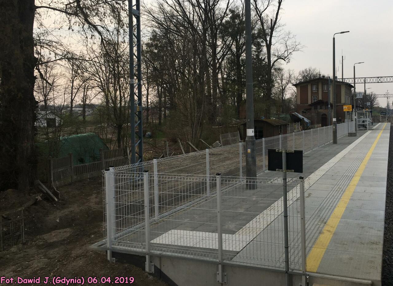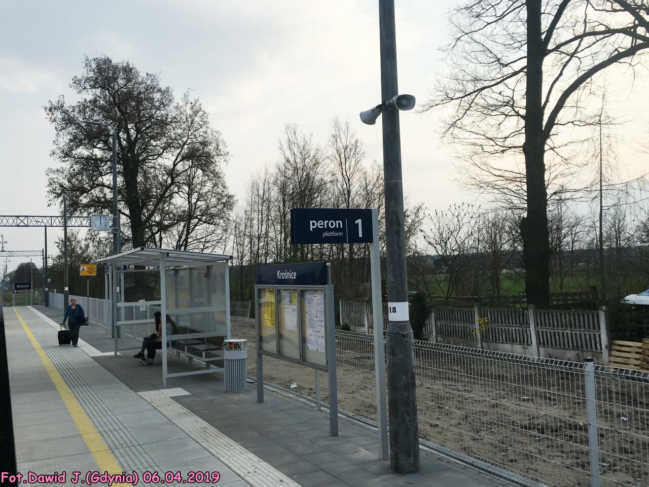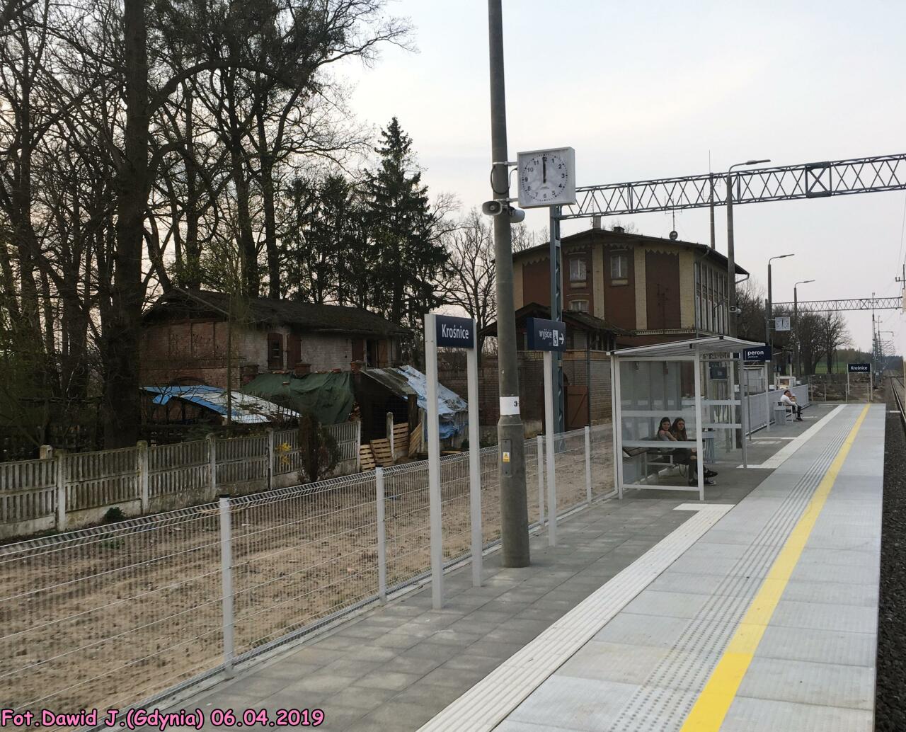 Widok z peronu 1 w kierunku Milicza/Chojnic. Nowoczesna wiata na peronie. Budynek dworcowy, budynek WC, pobliski budynek gospodarczy po lewej stronie.