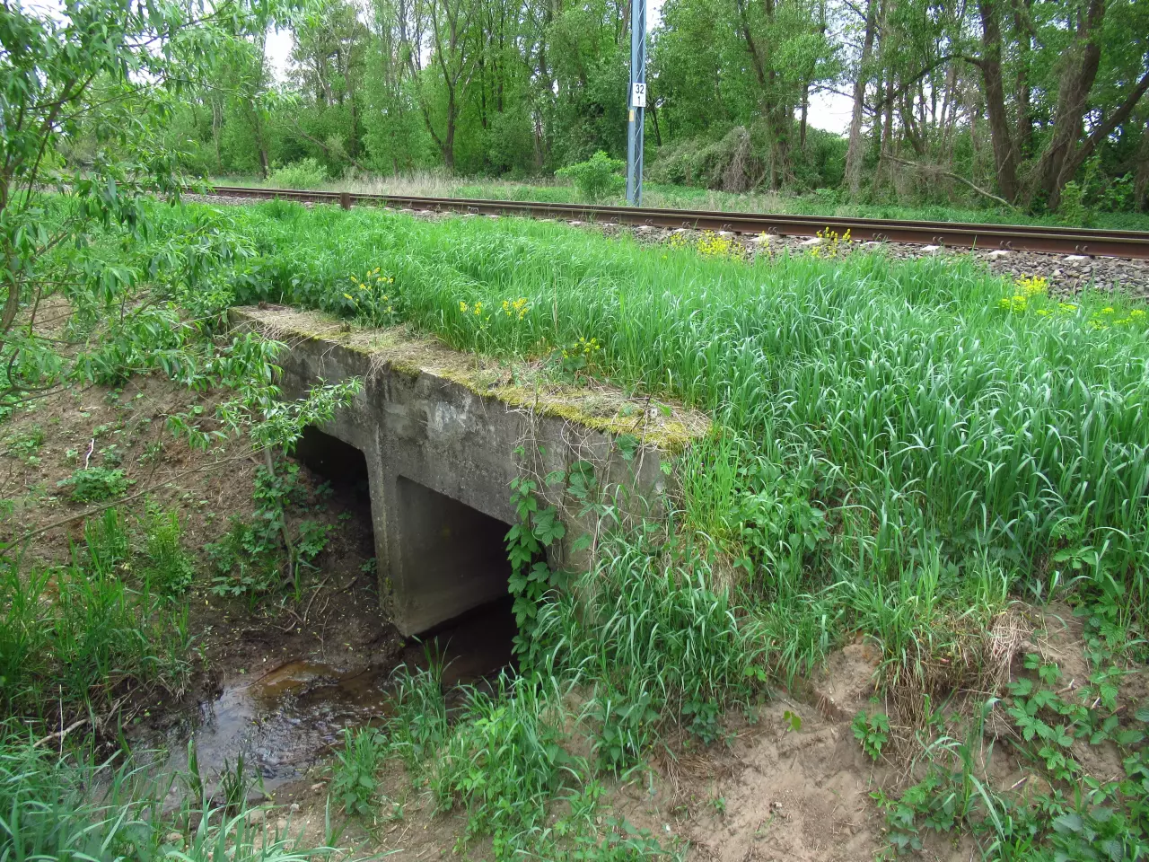 Przepust nad ciekiem struga. Wyjazd do Grabowna Wielkiego (na wprost). Kierunek południowo-zachodni.