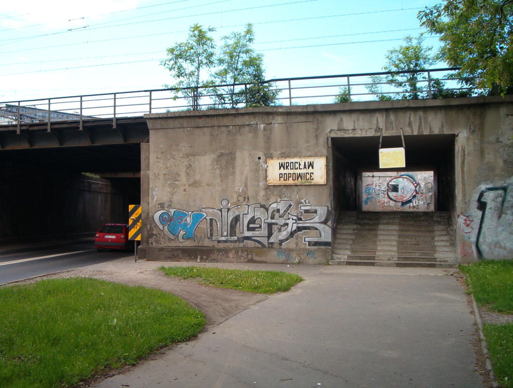 Wyjście ze stacji do ul. Popowickiej. Po prawej widoczne wejście do windy dla niepełnosprawnych. Górą wyjazdy do Wrocławia Nadodrze (w lewo), Wrocławia Mikołajów/Głównego (na wprost), Wrocławia Gądów (w prawo).