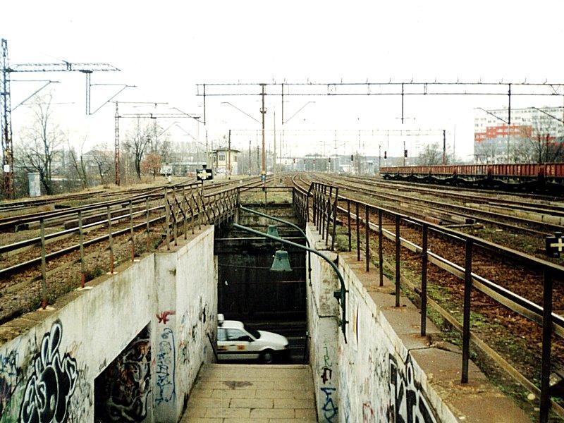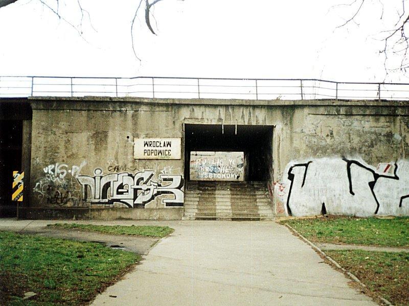 Winda dla niepełnosprawnych oraz wejście na perony położone pomiędzy wiaduktami kolejowymi nad ul. Popowicką. Widok od strony wjazdów z Wrocławia Mikołajowa/Głównego, Wrocławia Nadodrze i Wrocławia Gądowa.