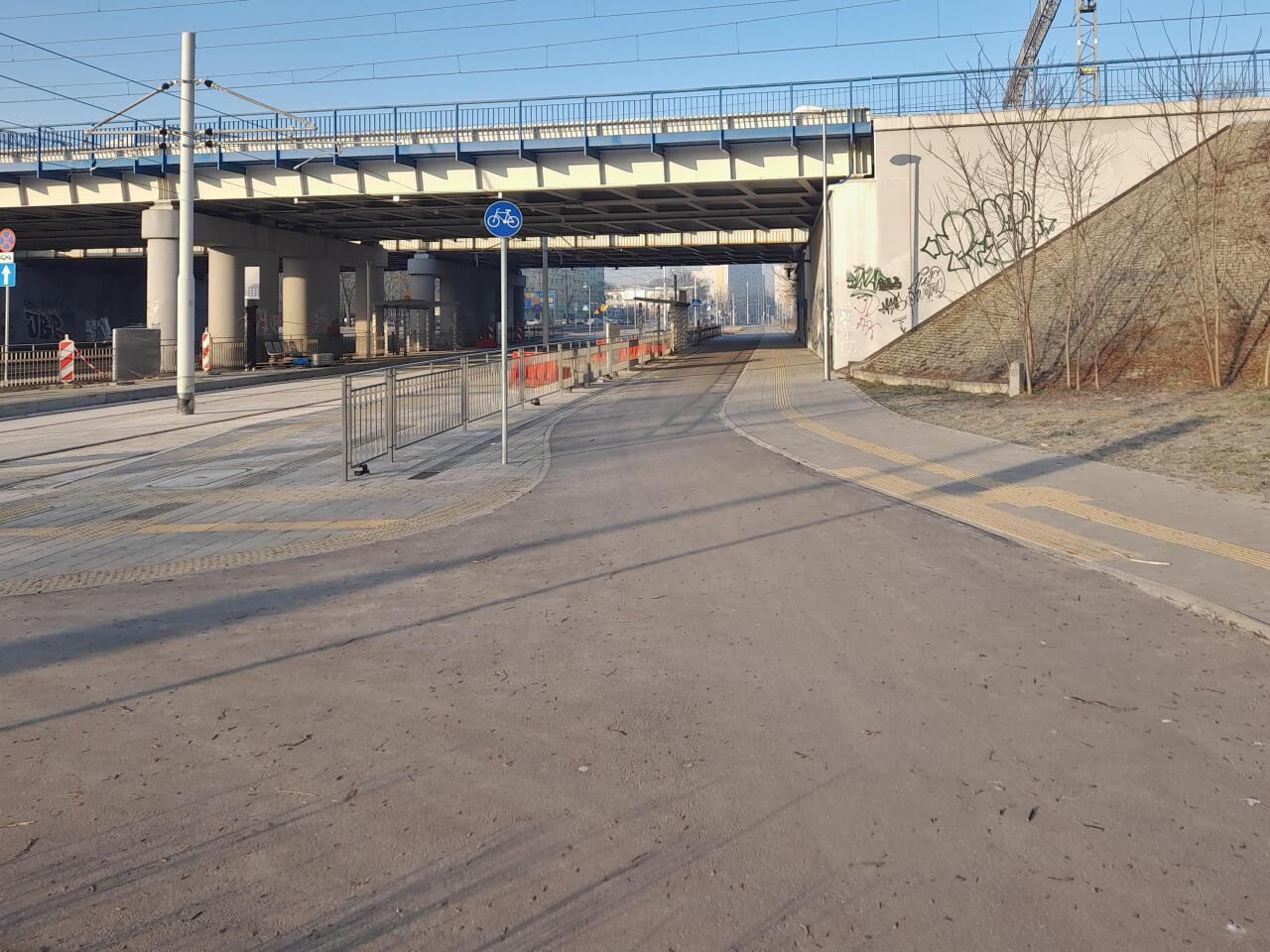 Modernizowana ulica Popowicka i wiadukt koło przystanku. Wejście na peron znajduje się po prawej stronie, pod wiaduktem. W lewo Wrocław Nadodrze, Wrocław Mikołajów/Główny, Wrocław Gądów.