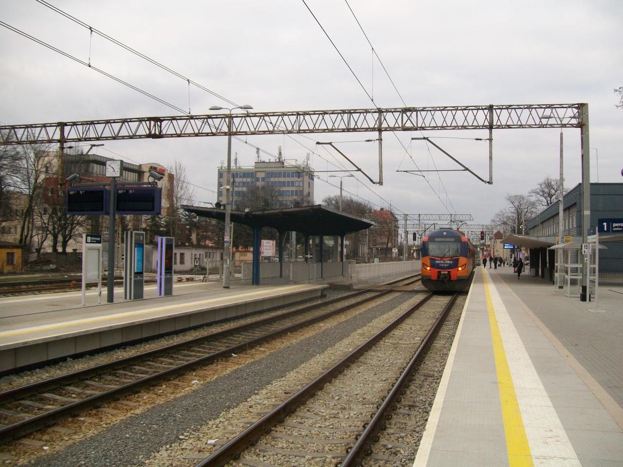 Widok na pasażerską część stacji po remoncie: z prawej peron 1, przy którym stoi pociąg do Wrocławia, z lewej peron 2. To, co zrobiono z wiatami woła o pomstę do nieba. Widok w kierunku południowo-wschodnim (Nowa Sól).