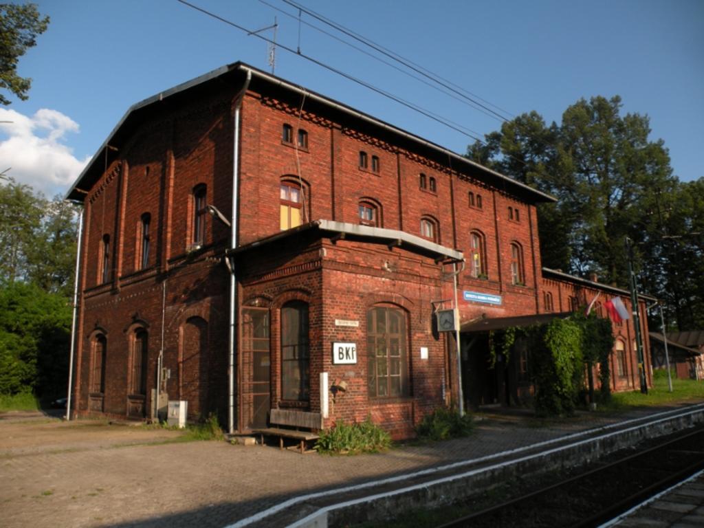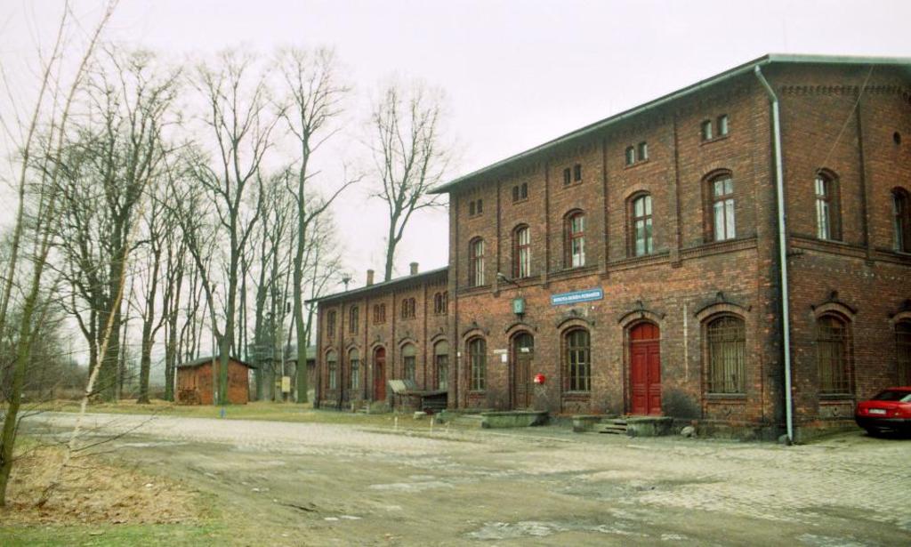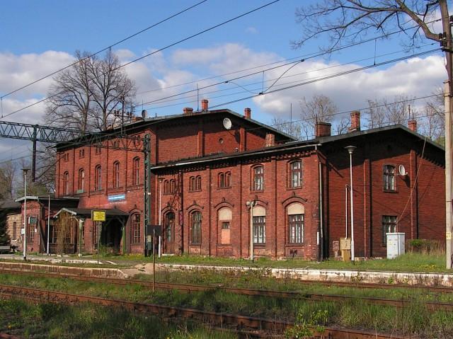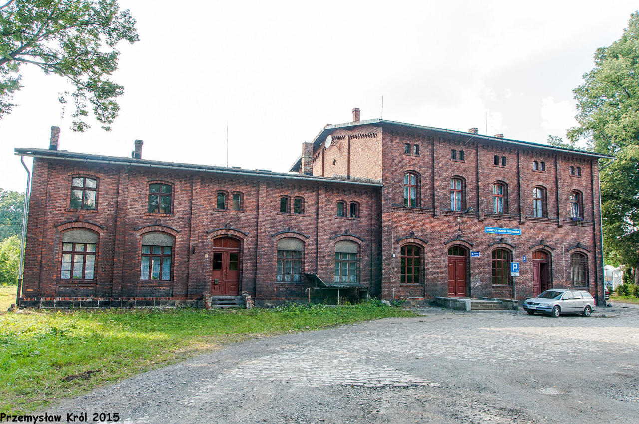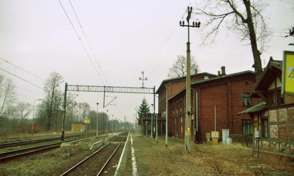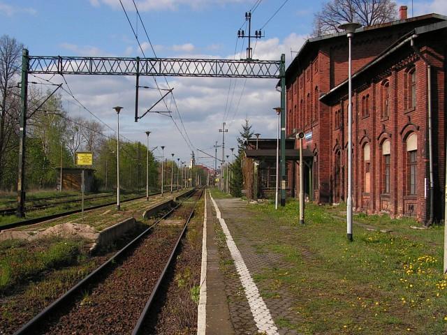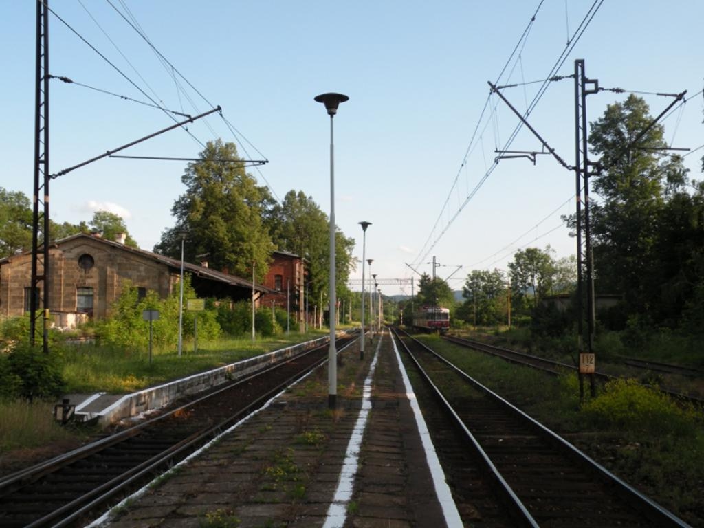 Budynek dworca i perony. W przybudówce na parterze znajduje się nastawnia dysponująca. Za nią, zasłonięte tu tory boczne służące m.in. do załadunku drewna. Widok w kierunku północnym, od strony Międzylesia.