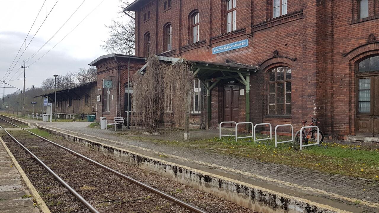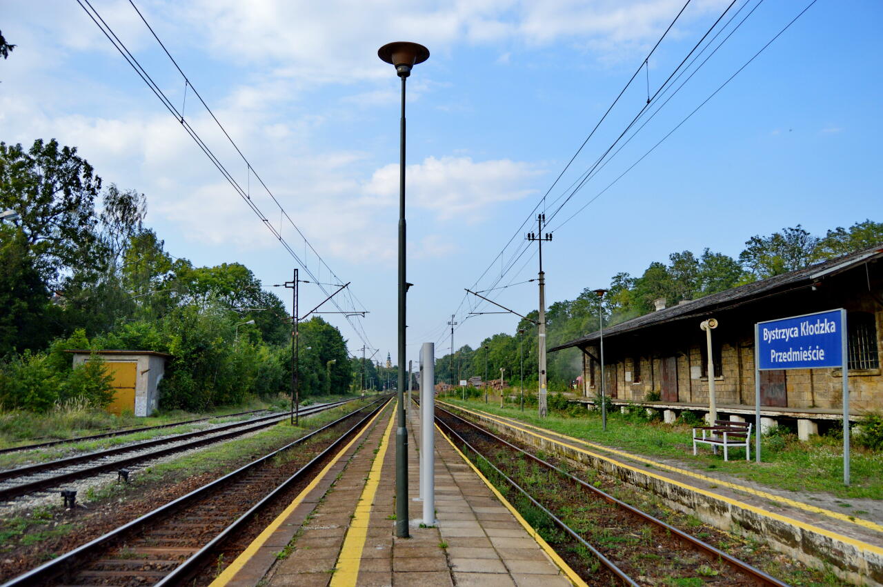 Okazały budynek dworca Bystrzyca Kłodzka Przedmieście. W przybudówce na parterze mieści się nastawnia dysponująca. Zarówno materiał (cegła) jak i bryła charakterystyczne dla dworców na linii z Wrocławia do Międzylesia. Widok w kierunku północno-wschodnim; w lewo Kłodzko/Wrocław, w prawo Międzylesie.
