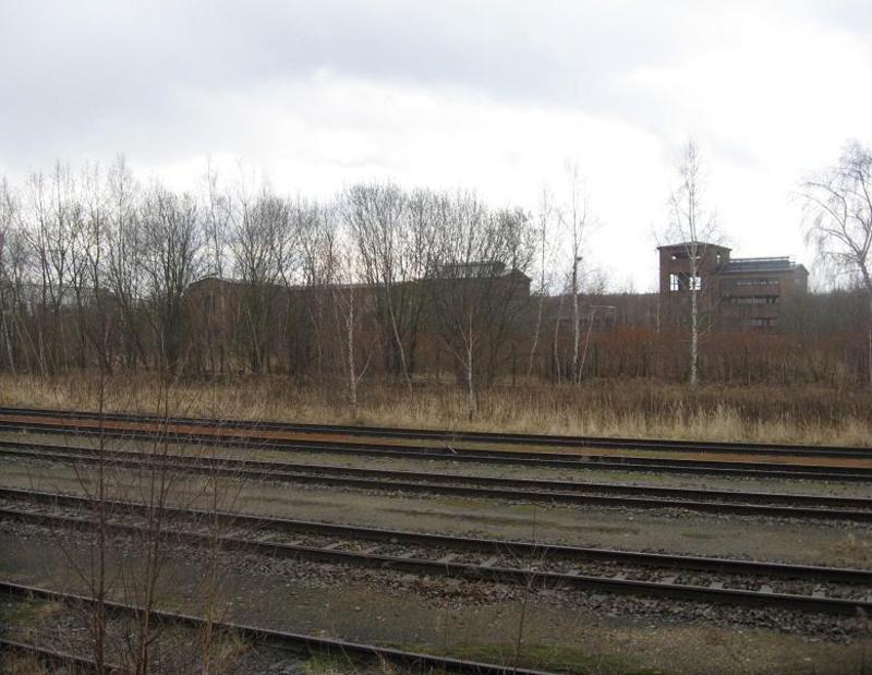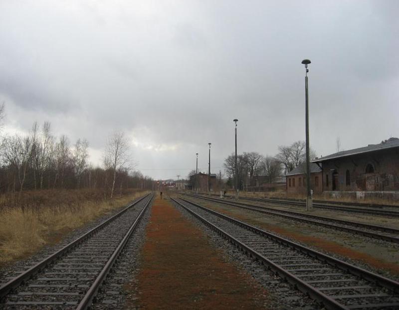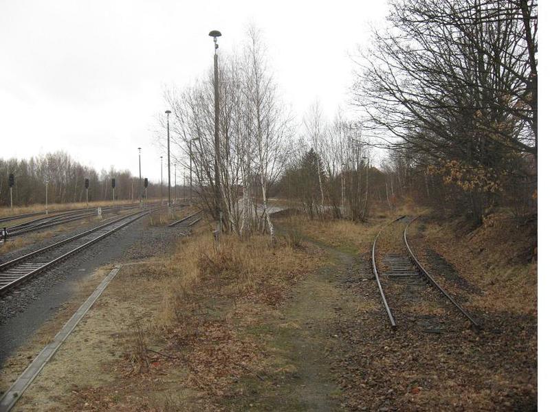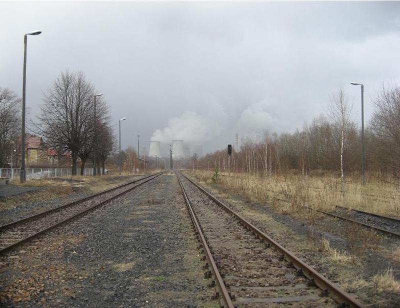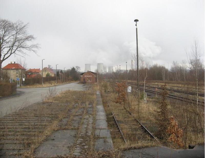 Zarośnięte i zardzewiałe tory boczne są mimo wszystko wciąż przejezdne. Z prawej strony odchodzi tor do niegdysiejszej elektrowni "Hirschfelde". W tle potężna elektrownia w Turoszowie, po polskiej stronie granicy. Widok w kierunku północnym (perony w nowej lokalizacji, Trzciniec/Görlitz).
