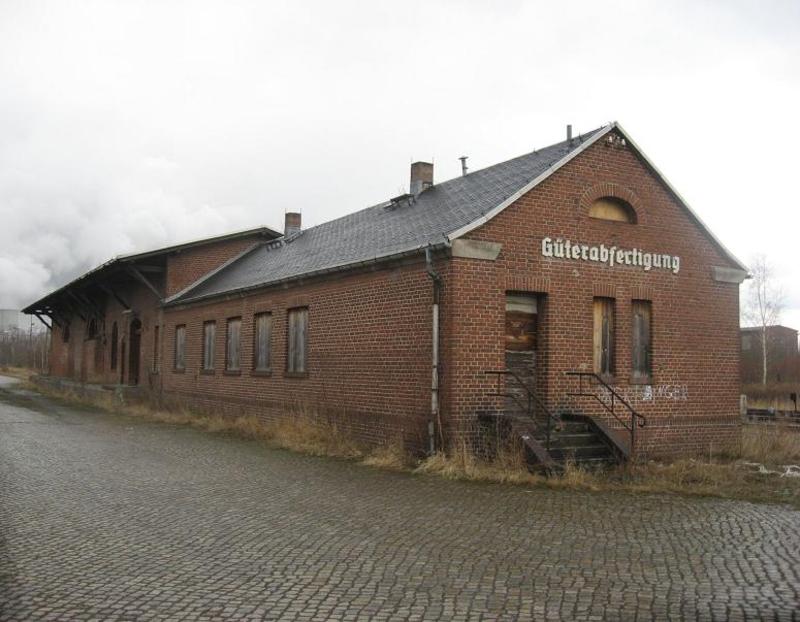 Opuszczony magazyn, na drugim planie budynek dworca - również opuszczony. Widok w kierunku południowo-zachodnim (Żytawa).