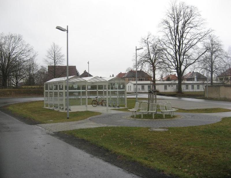 Bardzo dobrze urządzony plac przed nowym peronem. Zwraca uwagę kryty parking dla rowerów.