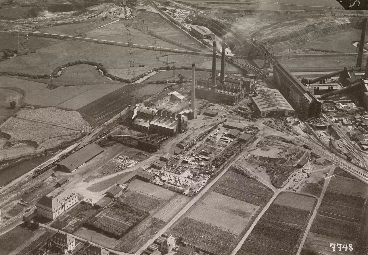 Elektrownia Hirschfelde w latach międzywojennych. Z prawej widoczne, dochodzące od stacji tory. U góry kadru widoczne mosty nad Nysą Łużycką - jeden prowadzący tor na składowisko popiołu, drugi dla składów przywożących węgiel z turoszowskiej odkrywki. Organizacyjne tak to wyglądało do czasu powstania Elektrowni Turów. Widok w kierunku południowo-wschodnim. Źródło zdjęcia: https://fotothek.slub-dresden.de/fotos/hi/kw/0000000/hi_kw_0000400.jpg.