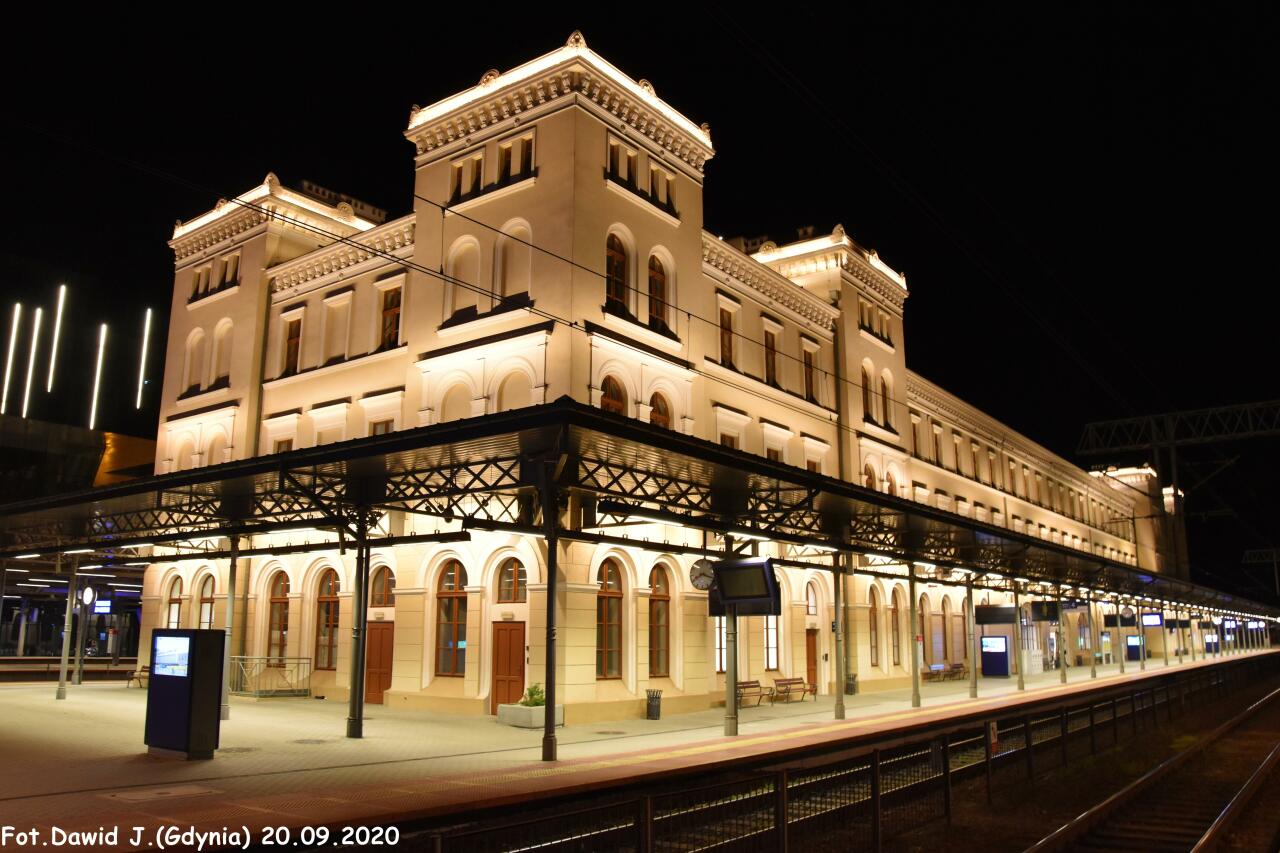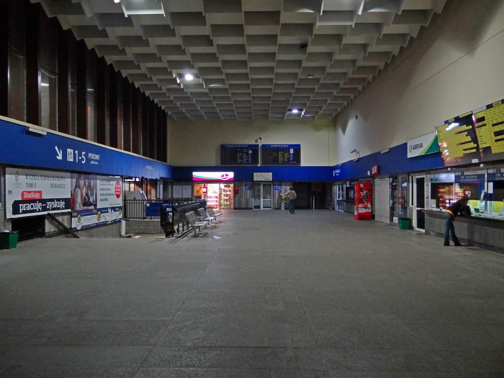 Wyspowy budynek dworca, położony między peronami 4 i 5 (po północnej stronie, z prawej) i 3, 2, 1 (po południowej stronie, z lewej). Widok w kierunku południowo-zachodnim, od strony wjazdów z Maksymilianowa (dalej Gdynia i Tczew), Bydgoszczy Wschód (dalej Chełmża, Toruń, Inowrocław). 160,0 km/ 307,3 km/ 127,8 km.