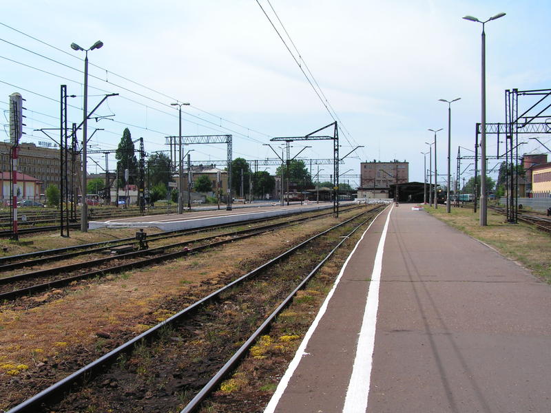 Początek peronu 4a, z lewej peron 3a. W tle wyspowy budynek dworca. Widok w kierunku południowo-zachodnim, od strony wjazdów z Maksymilianowa (dalej Gdynia i Tczew), Bydgoszczy Wschód (dalej Chełmża, Toruń, Inowrocław).