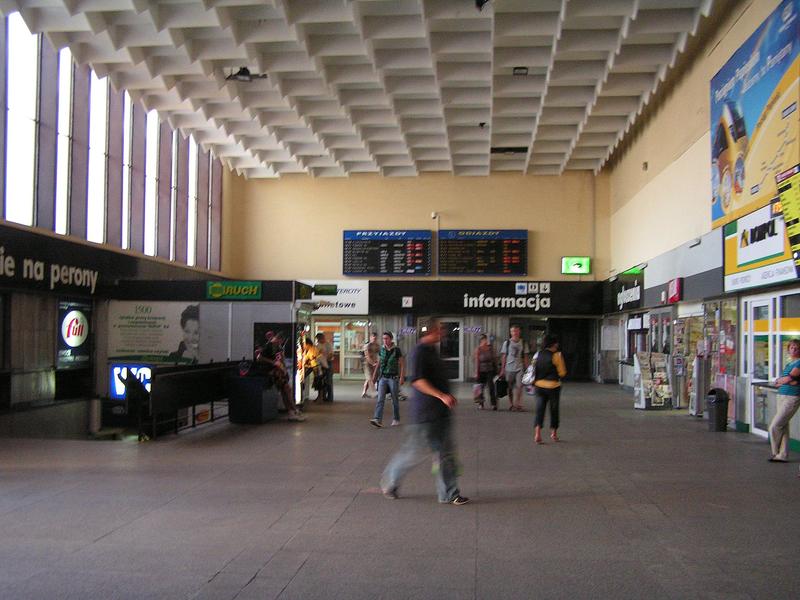 Wejściowy budynek dworca od strony miasta. Obiekt po przebudowie ukończonej w 1966 roku, funkcjonował do roku 2013. Hol główny. Po lewej wejście do przejścia podziemnego. Po prawej kasy biletowe. 160,0 km/307,3 km/127,8 km.