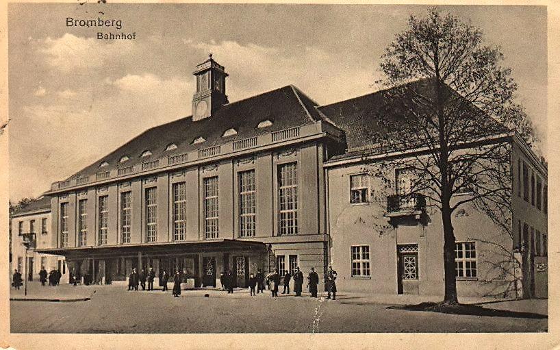 Wejściowy budynek dworca od strony miasta. Obiekt po przebudowie ukończonej w 1915 roku. Widok w kierunku północno-zachodnim: w lewo Nakło nad Notecią, Szubin/Poznań, Inowrocław (przez Brzozę Bydgoską), w prawo Maksymilianowo (dalej Gdynia i Tczew), Bydgoszcz Wschód (dalej Chełmża, Toruń, Inowrocław). Pocztówka ze zbiorów Miłosza Telesińskiego.